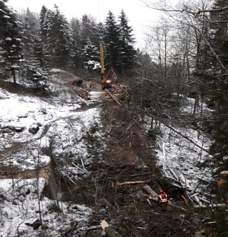 Moderne Gebirgsharvester mit Mobilseilkran sind im Einsatz.
