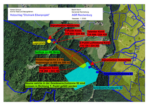 In unseren Gebieten werden die Holzschläge mit Seilkrananlagen ausgeführt. Holzschläge werden vom Forstamt angezeichnet und ein Anzeichnungsprotokoll und Kartenausschnitte erstellt. Zusammen mit dem Forstamt wird ein 8 seitiges Vertragswerk erarbeitet, worin die Details des Holzschlages und die Einhaltung der insgesamt 24 Punkte geregelt sind. Der Vertrag ist auf ein schonendes Vorgehen und Schützen des bestehenden Jungwaldes sowie der Eibenbäume ausgelegt.
